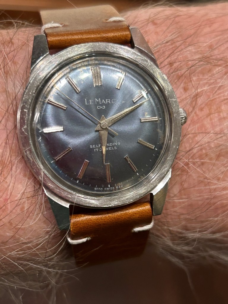 LeMarc is a brand of Marc Nicolet & Cie of La Chaux-de-Fonds. The Nicolet family has long roots in the watch producing region of Tramelan. I can’t tease out exactly which branch of the family this is, but they are still active in the watch industry. I would guess that this is a mid-1960’s example.