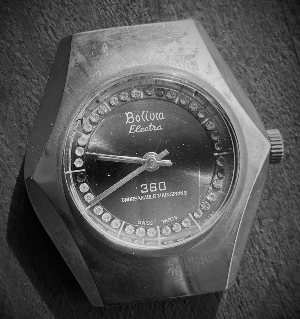 On old watches extra text can be quaint. Oh look, an “unbreakable mainspring”, that sounds impressive. “Electronically adjusted”, that must be modern because it is “electronic”. Everyone loves a “waterproof” watch, why not? A “jeweled lever” you say? I’ll buy.