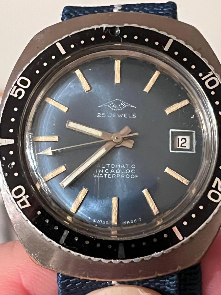 SO yes – a 1960s Talis Skin Diver, with a blue dial. What would you call it – marine blue?