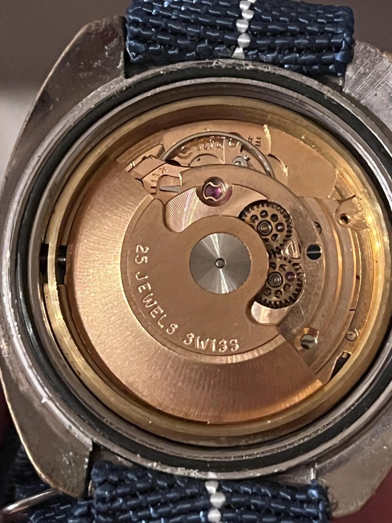 The movement is interesting – 25J Automatic Incabloc… popping the back reveals an unsigned ETA 2472. This is a pretty common movement that was used between 1963-1971, decent enough.