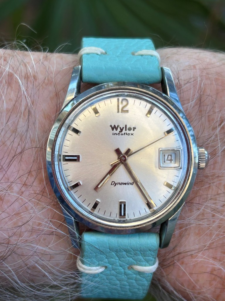What then of its close cousins, cream, off-white, gold, and silver? These are not nearly as easy. I find silver to be the hardest. Most of my watches in this color came on silver expandable bracelets, the easy choice for men of the era. Silver on silver looks washed out. Again, step up with color.