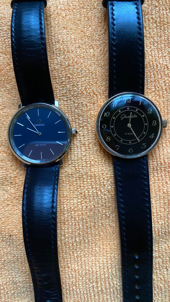 The Omega De Ville is 33mm and the Glashütte is 34mm. To me, they look like they could both be 33mm or 34mm. The De Ville does seem a hair smaller if I squint my eyes, possibly as a result of the steel bezel surrounding it. The Glashütte is truly bezel-less. I have no idea how the crystal is attached to that dial. In terms of how they both wear, they wear the same to me. The De Ville “feels” smaller but it’s also fitted with a 17mm strap versus the Glashütte’s 18mm.