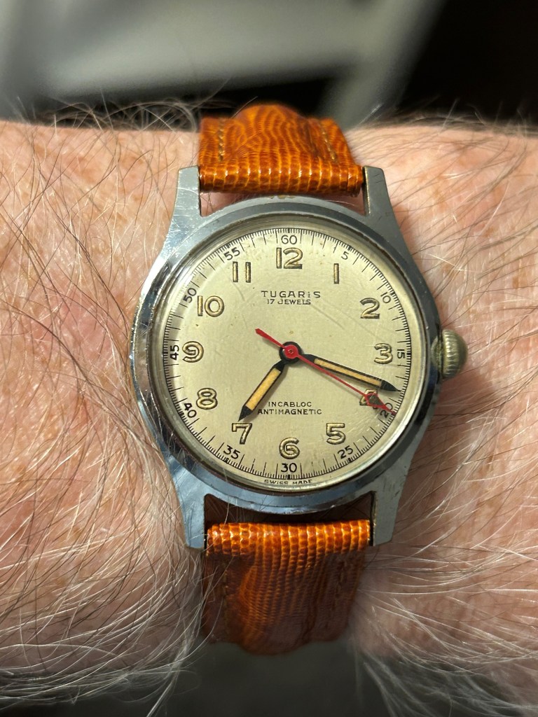 Tugaris was a brand of Tiara, S.A. that was registered in 1946. This looks to date from early in their history because it is a typical military style watch from the era. Chris inspired me to start collecting these. I already have too many. But I was scrolling and saw an auction that closed in 30 seconds. I thought, “that watch is too cheap” and bid less than $15.00 U.S. And it arrived on the last day of trial and appears to be keeping time. I cleaned it up and took off the cheap expandable band. I took a couple of passes at it with Polywatch. How many military style vintage watches does one need? The Escapement Room team is testing that question.