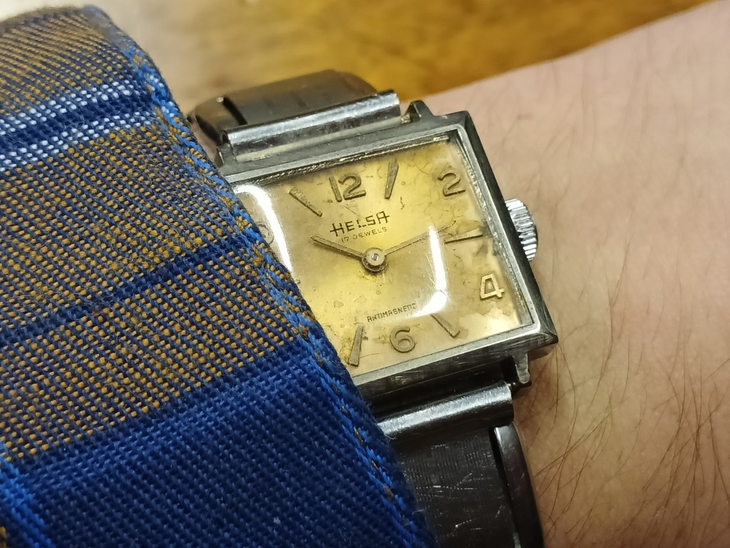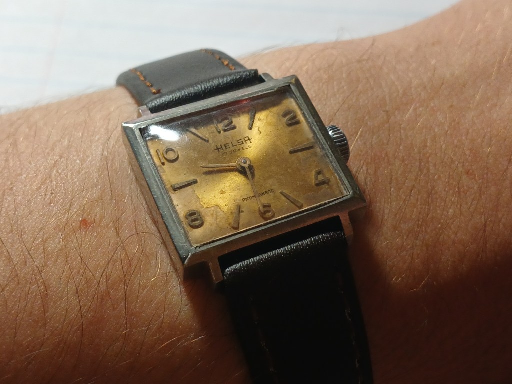 I exercised restraint and only left with three watches. The watchmaker was kind to me and said I could pay him for the watches if I got them running, otherwise I could bring them back and let them sit another forty years. The three I left with were the aforementioned Osco I chose for I, the black-dialed Camy, and a just about men’s size Helsa.